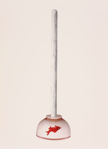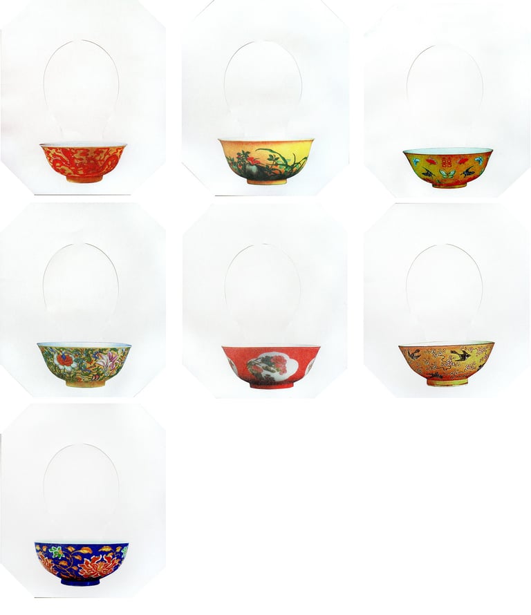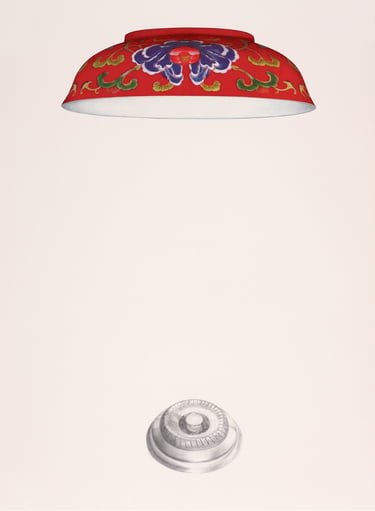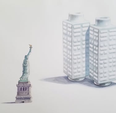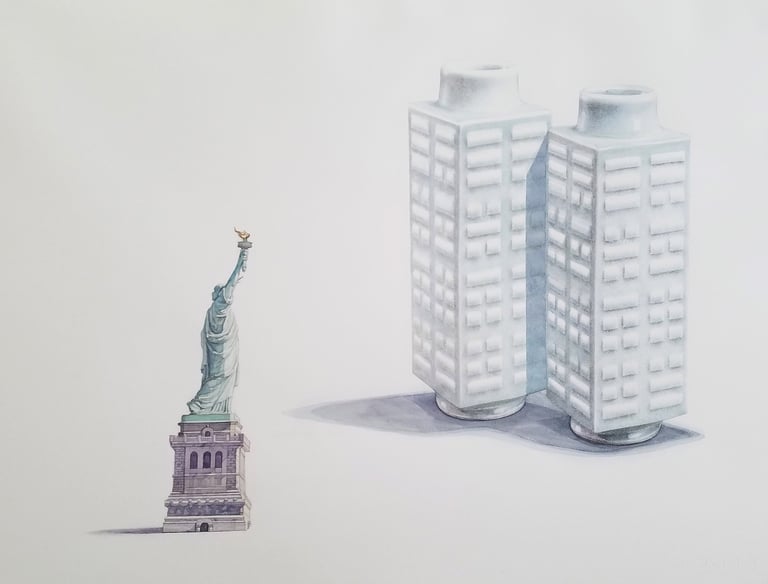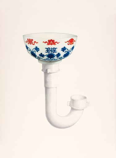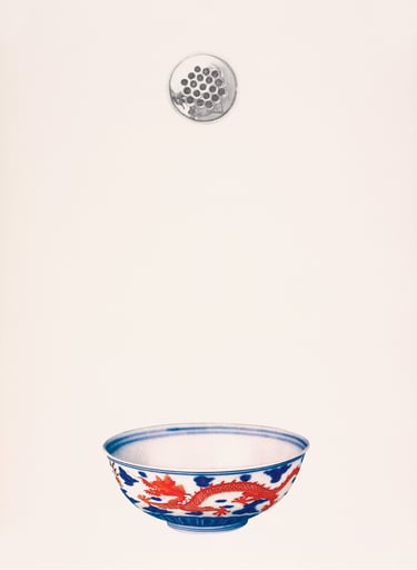 The series explores the conflicts of American and Chinese cultures in a broader content. I use watercolor and lithograph to combine Chinese antique porcelain wares (from Ming and Qing Dynasty) with American household objects, regional and national iconic images to present the complementary of classical Chinese and contemporary American culture, fine art and functional, high and low aesthetics. With a surrealistic approach, I attempt to communicate this idea in a humorous way.